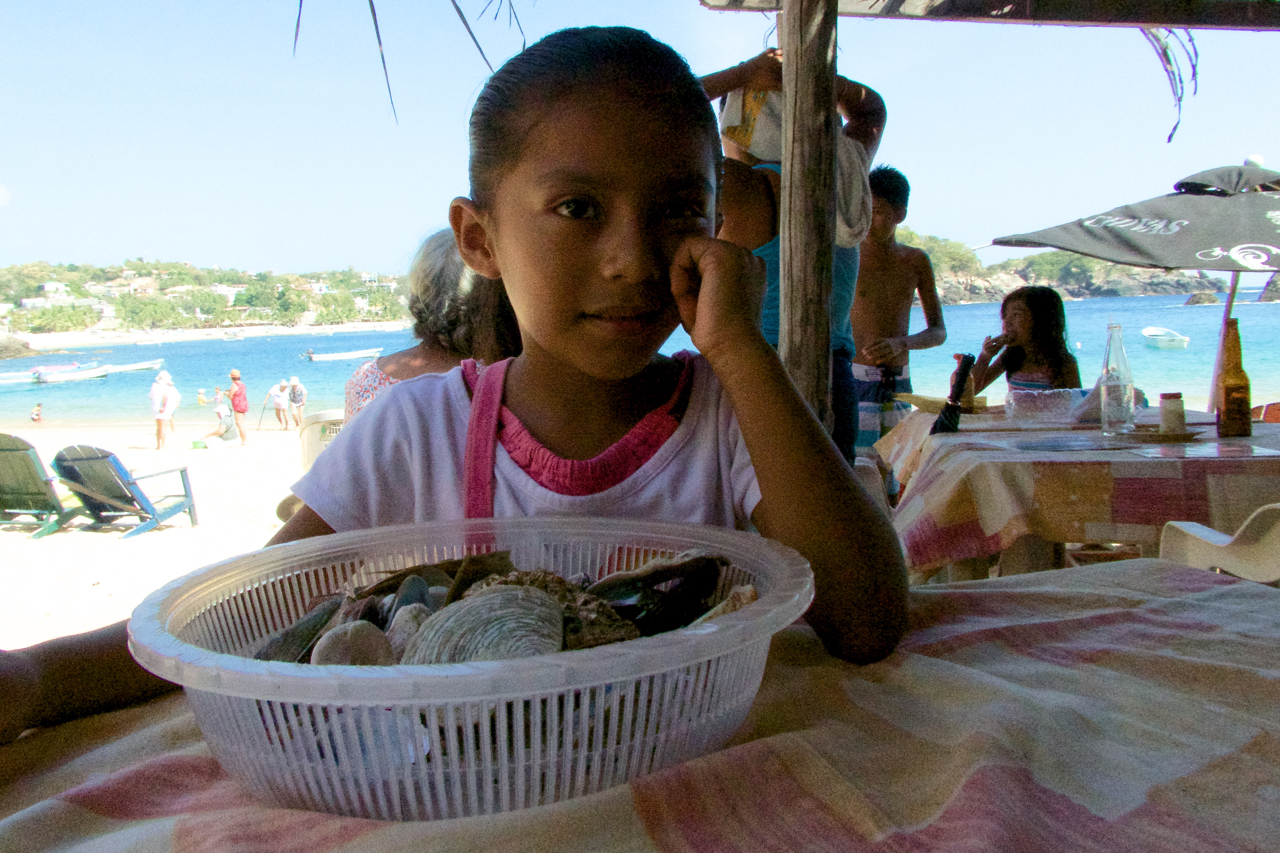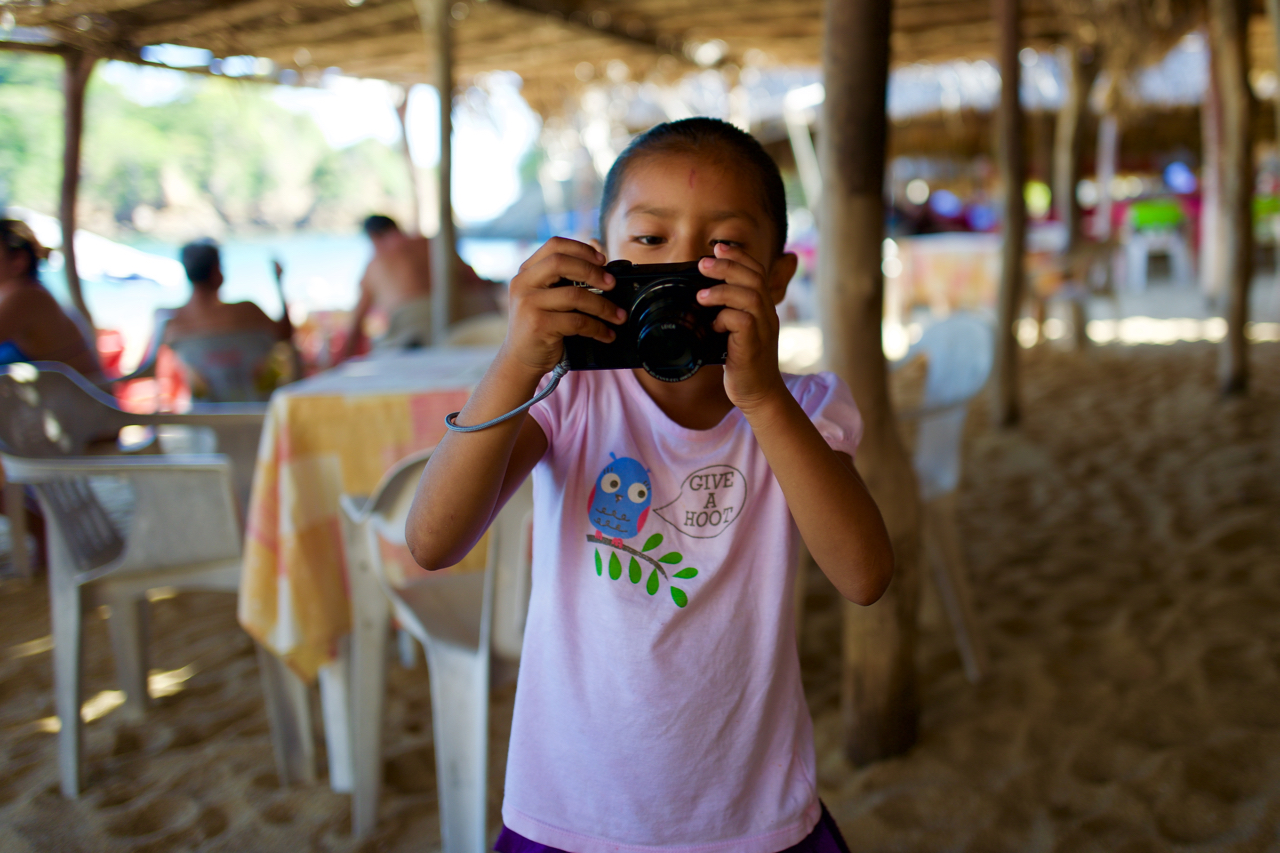 So she started taking snaps…Hunting….Tourist with water in hand…Indian woman with all her artisans goods fellows… Must be so hot!No McDog food here. These are the real deal. iPhone snap.The water dancer….Iphone snap….Another view of San Agustinillo beach….What? Shot by Elizabeth.They call me Mr. Grumpy…Smile kid….Today I gave her a little Winnie da Pooh, she loved it!Elizabeth is 5. She tries to make a few pesos by selling shells with the help of those big brown eyes…She was very curious of my little camera…