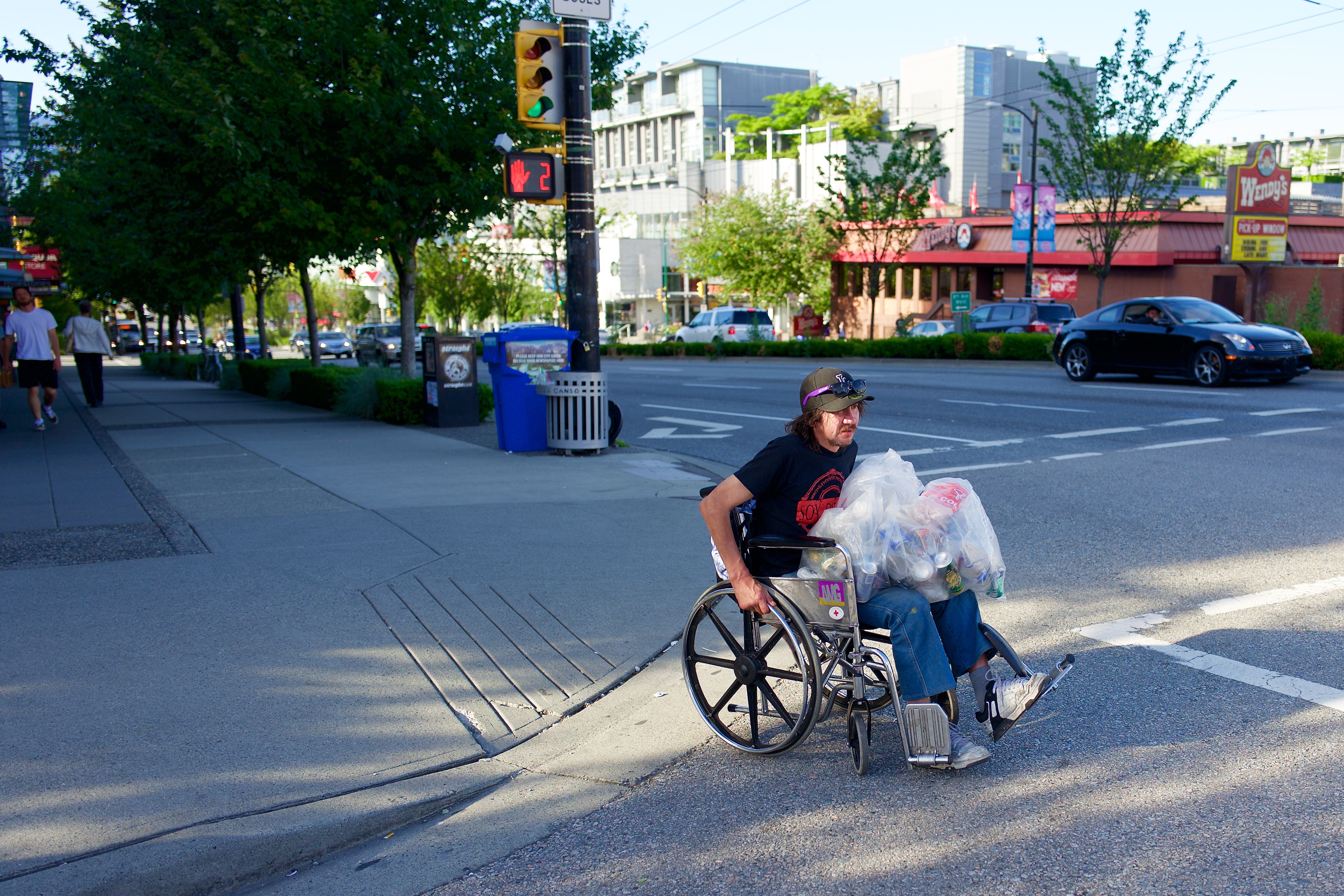 This poor guy has to empty his urine sack in a street drain because of a lack of public washrooms. Vancouver, BC. This poor guy has to empty his urine sack in a street drain because of a lack of public washrooms. Vancouver, BC.